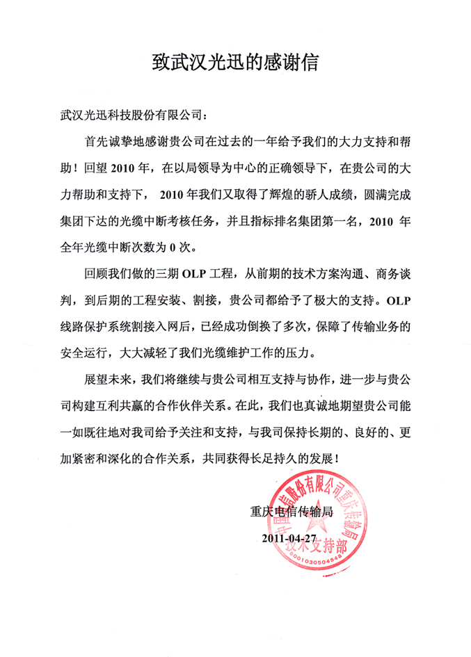 OLP(光纖線路保護(hù)系統(tǒng))--光迅科技最給力的產(chǎn)品之一,在遙遠(yuǎn)的祖國西南部又結(jié)出了累累碩果。2008年至今,三年間重慶電信共建設(shè)了三期OLP項(xiàng)目,大幅減少了傳輸業(yè)務(wù)中斷的次數(shù)。尤其是2010年,重慶電信不僅圓滿完成了中國電信集團(tuán)下達(dá)的光纜中斷考核任務(wù),更以2010年全年光纜中斷次數(shù)為0的指標(biāo)獲得中國電信集團(tuán)各省分公司第一名的佳績。輝煌的成績背后光迅科技提供的OLP系統(tǒng)功不可沒,多次受到重慶電信領(lǐng)導(dǎo)的褒獎(jiǎng),并專門向光迅科技發(fā)來感謝信,對(duì)公司提供的服務(wù)給予充分的肯定。目前,四川電信、四川聯(lián)通、四川移動(dòng)、重慶聯(lián)通、西藏電信也都相繼選擇了光迅科技的OLP系統(tǒng)來為傳輸業(yè)務(wù)保駕護(hù)航,這為光迅科技在西南片區(qū)樹立了良好形象,也為OLP系統(tǒng)在其他地區(qū)的市場推廣起到了很好的宣傳作用。