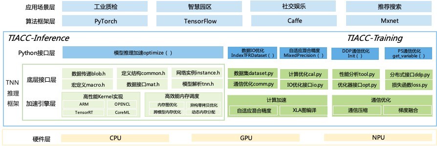TI-ACC在推理階段所呈現(xiàn)的高性能,得益于底層的TNN基礎(chǔ)框架。據(jù)了解,TNN是騰訊優(yōu)圖實驗室向行業(yè)開源的部署框架,TI-ACC在TNN接口基礎(chǔ)上進(jìn)行產(chǎn)品化封裝,提供一鍵式推理加速功能。