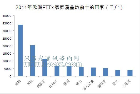 2011年底,歐洲FTTH/B家庭覆蓋數(shù)達到2900萬(FTTx家庭覆蓋數(shù)達到1.33億,包括VDSL,F(xiàn)TTLA),用戶520萬(1440萬FTTx用戶)。老牌運營商僅占到那些部署的部分(歐洲家庭光纖覆蓋剛剛超過30%),但是他們?nèi)匀皇悄切┰鲩L潛力最大的。事實上,所有的歐洲老牌運營商要么已經(jīng)推出了FTTH/B,要么正在整裝待發(fā),要么正處于計劃階段,并宣布將投資數(shù)十億歐元。進一步來說,他們之中的有一些在國內(nèi)市場已經(jīng)大力地卷入VDSL項目(2011年底,德國電信家庭覆蓋數(shù)超過1200萬,比利時電信380萬,瑞士電信350萬,土耳其電信300萬),在覆蓋地區(qū)的滲透率不同國家也不同,從德國的大概6%到瑞士的50%。