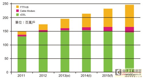 在中國整體固網(wǎng)寬頻用戶發(fā)展下,除電信業(yè)者的FTTH/B外,有線電視業(yè)者的纜線數(shù)據(jù)機(jī)(Cable Modem)因三網(wǎng)融合效益也將刺激用戶成長,部分業(yè)者也有意采用EPON整合纜線數(shù)據(jù)服務(wù)介面規(guī)格(DOCSIS)的架構(gòu),牽引出另一個(gè)EPON用戶的成長可能性;然xDSL用戶規(guī)模則在光纖持續(xù)往最后一哩進(jìn)逼下產(chǎn)生替代效應(yīng),預(yù)計(jì)將從2014年后開始滑落。