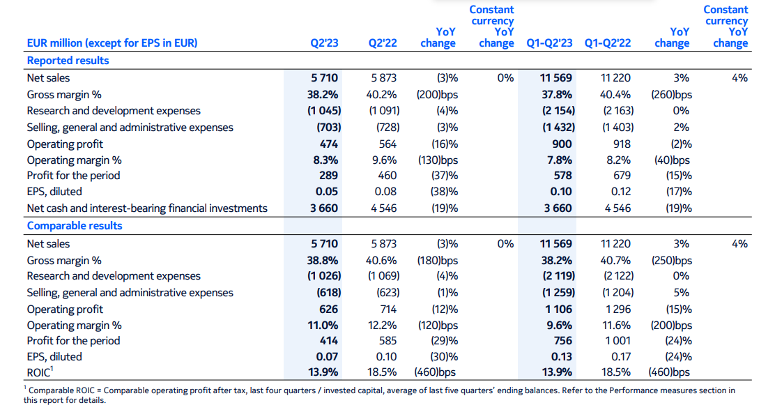 ICC訊(編譯:Vicki)諾基亞公布了其截止至2023年6月30日第二季度的業(yè)績報告。報告顯示,該季度諾基亞收入為57.1億歐元,同比下滑3%。凈利潤2.89億歐元,去年同期凈利潤為4.6億歐元,同比下滑37%。二季度毛利率為38.2%,去年同期為40.2%。