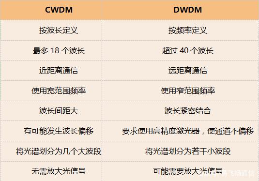 答:DWDM和CWDM的概念是相同的,即在一根光纖上使用多個(gè)不同的波長(zhǎng),但它們的波長(zhǎng)間距、通道數(shù)量、傳輸距離和光空間中放大復(fù)用信號(hào)的能力不同。
