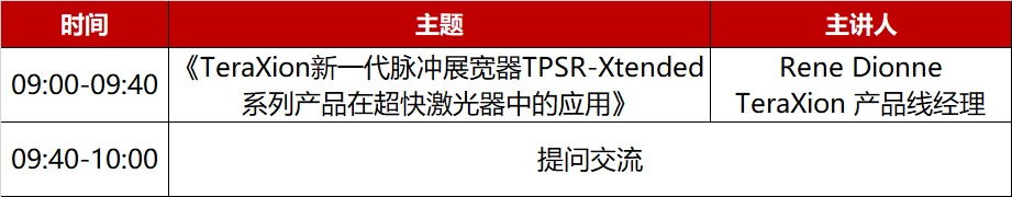 此次新品發(fā)布,特邀TeraXion產(chǎn)品線經(jīng)理Rene Dionne于本周四(12月17日)上午09:00~10:00線上分享《TeraXion新一代脈沖展寬器TPSR-Xtended系列產(chǎn)品在超快激光器中的應用》,具體安排如下: