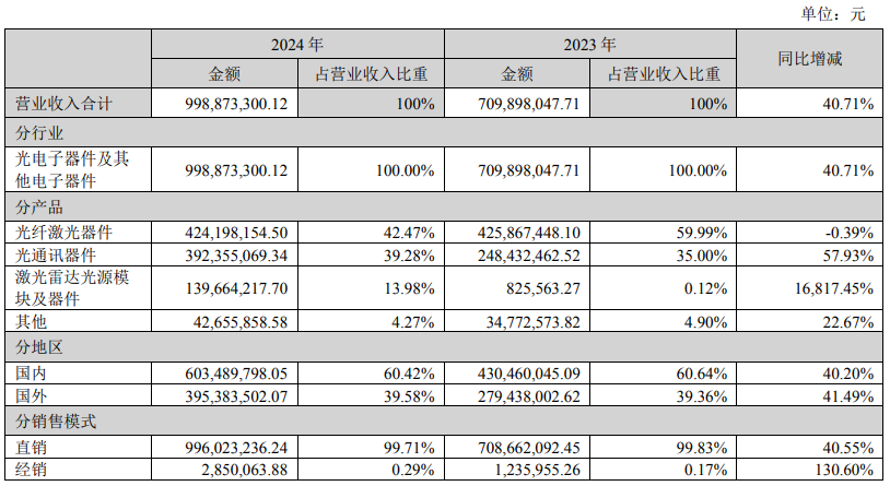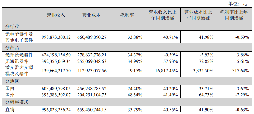 2024年,公司光通訊器件生產(chǎn)量、銷售量分別較上年增長(zhǎng) 111.47%、107.54%,主要是數(shù)據(jù)中心需求激增,公司通過技術(shù)創(chuàng)新、推出新產(chǎn)品、積極拓展國(guó)內(nèi)外市場(chǎng),光通訊器件訂單相應(yīng)增加所致。公告指出,2024年公司光通訊器件產(chǎn)能較上年同期增加 205 萬件,上漲 110.81%,產(chǎn)量較上年同期增加 204.12 萬件,上漲111.47%,銷量較上年同期增加 200.63 萬件,上漲 107.54%,營(yíng)業(yè)收入較上年同期增加 14,392.26 萬元,上漲 57.93%,毛利率較上年下降 5.61%。