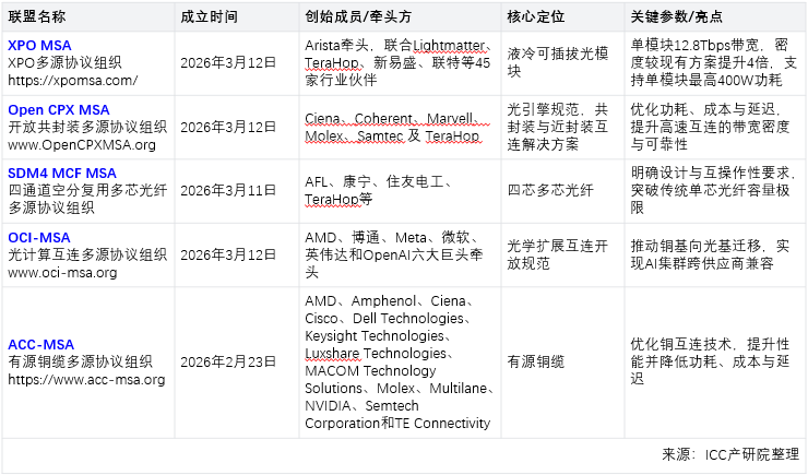 ICC訊 在光通信行業(yè)一年一度的核心會議OFC開幕前夕,一場關(guān)乎AI互連未來的行業(yè)變革悄然上演。2026年2月至3月短短20天內(nèi),五大多源協(xié)議(MSA)聯(lián)盟XPO MSA、Open CPX MSA、SDM4 MCF MSA、OCI-MSA和ACC-MSA相繼宣告成立,覆蓋光互連、高速銅互連等AI數(shù)據(jù)中心核心互連領(lǐng)域,吸引了全球40余家產(chǎn)業(yè)鏈龍頭企業(yè)參與,密集程度創(chuàng)下行業(yè)紀(jì)錄,背后折射出AI時代互連技術(shù)標(biāo)準(zhǔn)化的迫切需求,也預(yù)示著AI互連產(chǎn)業(yè)正式進(jìn)入?yún)f(xié)同發(fā)展、規(guī)范升級的新階段。