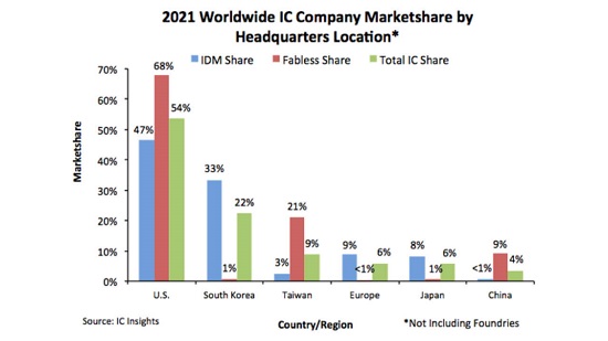 在IC Insights追蹤的另一個(gè)細(xì)分市場(chǎng)無(wú)晶圓廠中,中國(guó)大陸表現(xiàn)更好一些,以9%排名第三,低于美國(guó)的68%和中國(guó)臺(tái)灣的21%,但領(lǐng)先于韓國(guó)、歐盟和日本。即便如此,與2020年相比還是出現(xiàn)了巨大下滑,當(dāng)時(shí)中國(guó)大陸也排名第三,但占有15%的份額。總體而言,