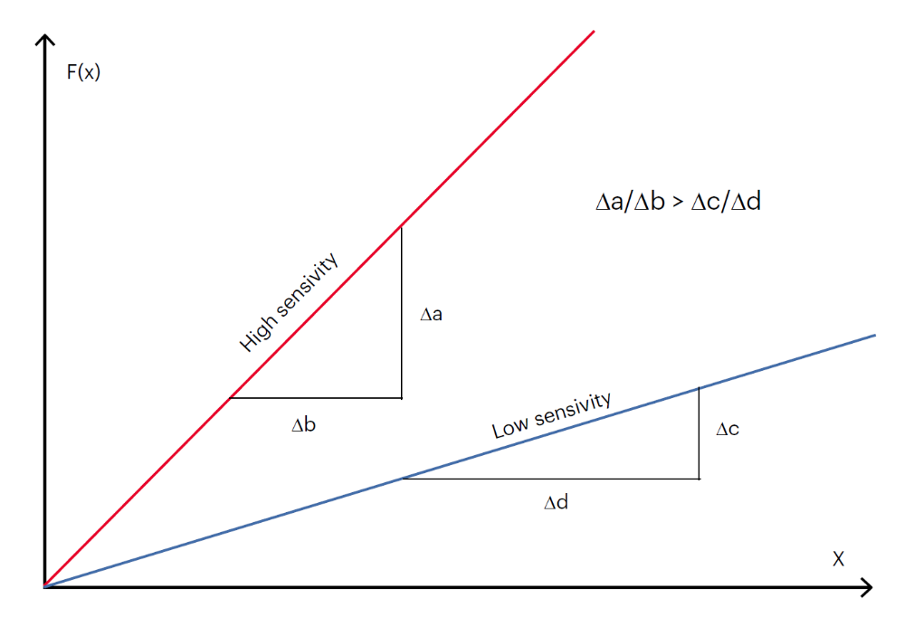 靈敏度是傳感器的重要特性之一,它決定了傳感器在捕捉或測(cè)量物理參數(shù)中的細(xì)微變化方面具有怎樣的性能。圖 2 所示為兩個(gè)具有不同靈敏度的傳感器。假設(shè)傳感器都有線性輸出,輸出的梯度代表了傳感器的靈敏度。例如,Δa 和 Δb 的比值就是紅線的梯度。產(chǎn)生紅線輸出的傳感器比產(chǎn)生藍(lán)線輸出的傳感器具有更高的靈敏度。典型的傳感器在其整個(gè)范圍內(nèi)可能不會(huì)產(chǎn)生線性響應(yīng)。因此,不同范圍內(nèi)的靈敏度可能會(huì)發(fā)生變化。