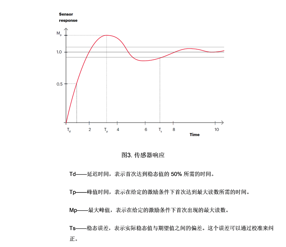 圖 3 所示為在階躍電平發(fā)生變化時(shí)受到輸入?yún)?shù)激勵(lì)的傳感器做出的輸出響應(yīng)。圖中的橫軸代表傳感器響應(yīng)的測(cè)量時(shí)間。當(dāng)傳感器輸出典型值與輸入?yún)?shù)的階躍電平變化對(duì)應(yīng)時(shí),輸出會(huì)切換到新的電平。但是,當(dāng)它達(dá)到新電平后,會(huì)出現(xiàn)過(guò)沖和下沖現(xiàn)象,需要經(jīng)過(guò)一段時(shí)間才能穩(wěn)定到新電平。