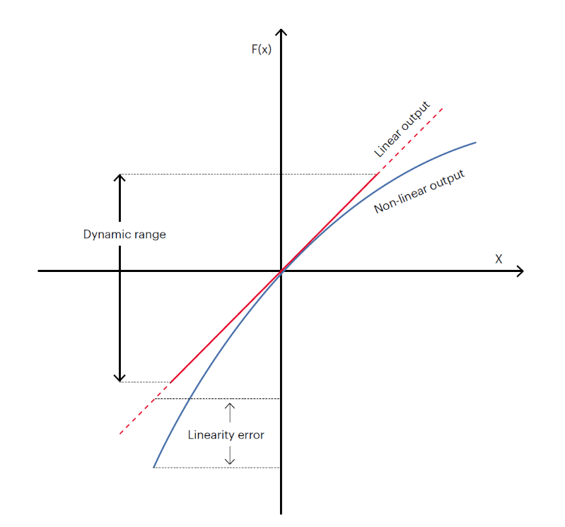 圖 4 所示為兩種傳感器的輸出圖。其中,藍(lán)線是傳感器的非線性輸出,在傳感器量程的兩端,測(cè)量精度明顯變差。紅線表示傳感器的理想線性輸出。如圖所示,線性誤差是藍(lán)線和紅線之間的 F(x) 差值。