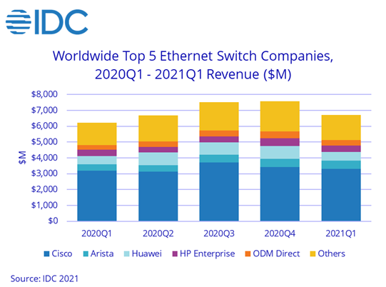 ICC訊(編譯:Nina)根據(jù)IDC近日發(fā)布的報告,2021年第一季度,全球以太網(wǎng)交換機市場收入達到67億美元,同比增長7.6%。同時,全球企業(yè)和服務提供商(SP)路由器市場同比增長14.4%至34億美元。