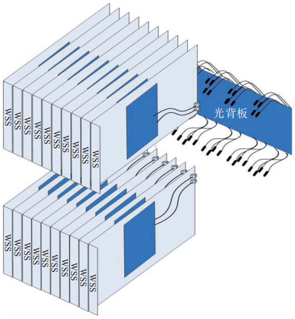 由于光存儲(chǔ)、光處理、波長(zhǎng)轉(zhuǎn)換等關(guān)鍵技術(shù)還不夠成熟,現(xiàn)有光交叉技術(shù)主要是采用波長(zhǎng)選擇交叉開(kāi)關(guān)或空間光交叉開(kāi)關(guān)的光線路交換技術(shù)。光交叉設(shè)備主要由光交叉連接矩陣、輸入接口、輸出接口、管理控制單元等模塊組成。光交叉已發(fā)展為集成式光交叉,如圖1所示,集成式光交叉以光背板技術(shù)為核心,分別采用硅基液晶、高密度光連接器、數(shù)字化光層等關(guān)鍵技術(shù),可大大減少單板堆疊,免除板間連纖,實(shí)現(xiàn)單板即插即用,提高系統(tǒng)的可靠性,構(gòu)建更高維度全光交叉互聯(lián)[4]。