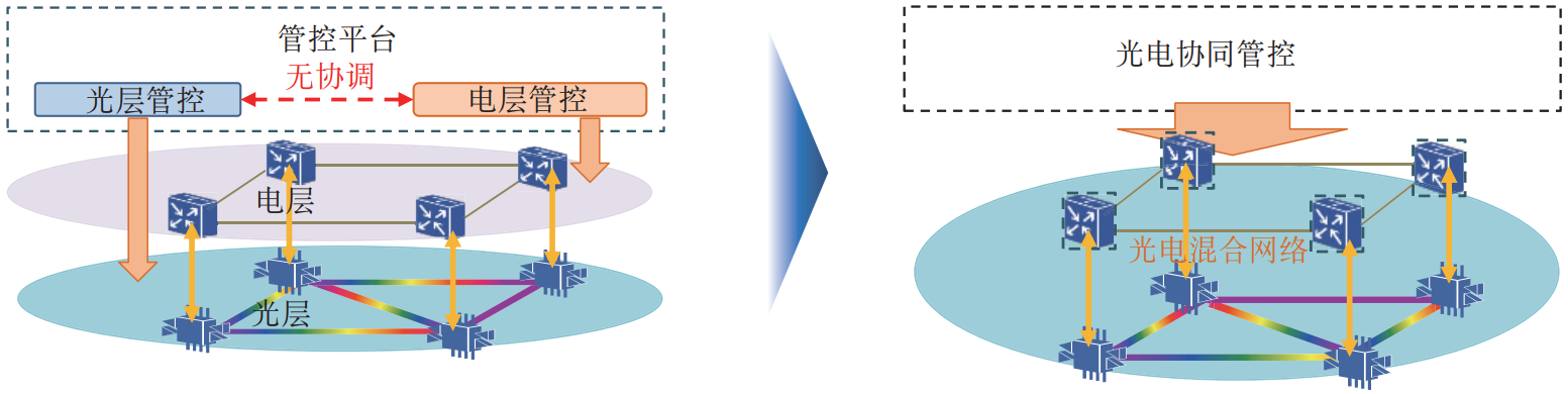 為進(jìn)一步提高全光網(wǎng)業(yè)務(wù)開(kāi)通速度、提升運(yùn)維效率,需要定義自動(dòng)化的光電協(xié)同管控方案,實(shí)現(xiàn)光電管控深度協(xié)同,統(tǒng)一調(diào)度,推動(dòng)光電混合全光網(wǎng)由原本光電分別獨(dú)立控制的兩張網(wǎng)絡(luò)演進(jìn)為光電協(xié)同管控的一張網(wǎng)絡(luò)(見(jiàn)圖2)。