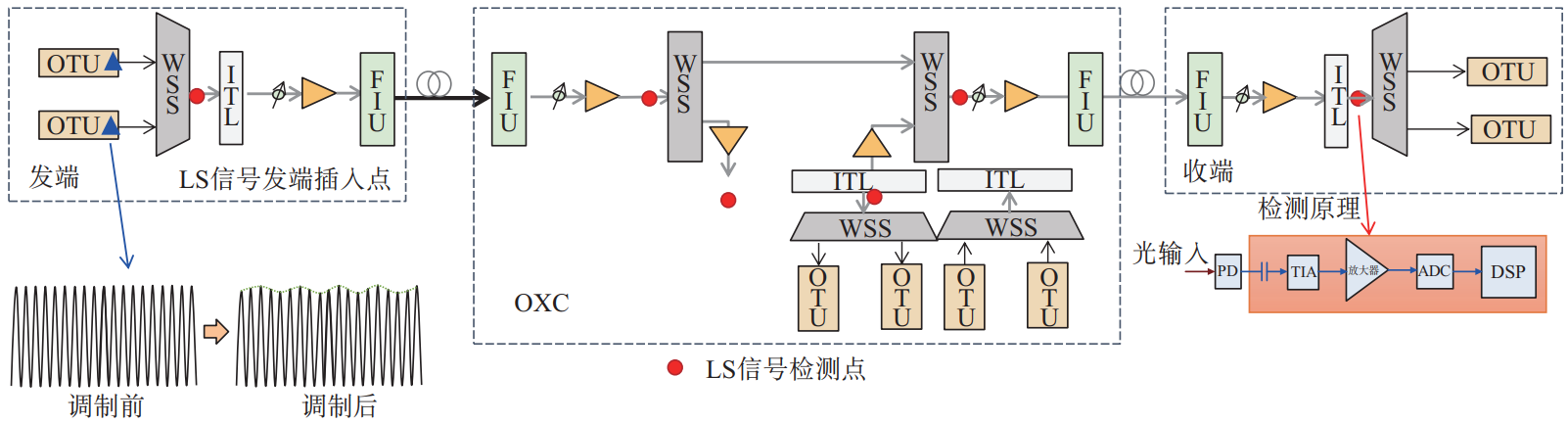 如圖3所示,在光電融合交叉設(shè)備的發(fā)送端,即每個(gè)OTU的輸出端,加載低頻調(diào)頂信號(hào),調(diào)頂信號(hào)頻率與信號(hào)波長(zhǎng)一一對(duì)應(yīng),實(shí)現(xiàn)波長(zhǎng)級(jí)調(diào)頂OAM。在光電混合全光網(wǎng)中各個(gè)節(jié)點(diǎn)設(shè)置檢測(cè)點(diǎn),實(shí)現(xiàn)調(diào)頂信號(hào)檢測(cè),在光信號(hào)波長(zhǎng)經(jīng)過(guò)的各個(gè)節(jié)點(diǎn)均可檢測(cè)開(kāi)銷(xiāo),從而識(shí)別信號(hào)波長(zhǎng)的各種關(guān)鍵特征信息。