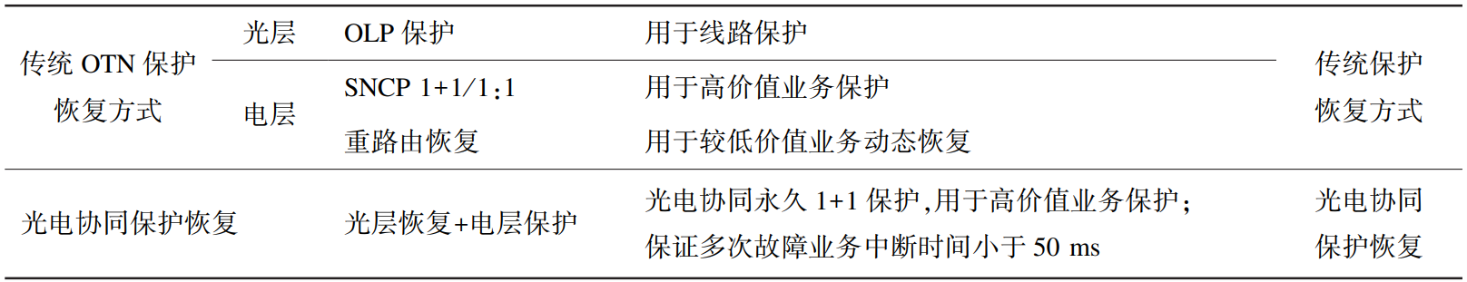 傳統(tǒng)的OTN網(wǎng)絡(luò)分別在光層提供了OLP保護(hù)和SNCP保護(hù),同時(shí)可以在電層進(jìn)行預(yù)置和動(dòng)態(tài)重路由恢復(fù)[8]。通過(guò)光層智能控制,在光電混合全光網(wǎng)中引入光層恢復(fù)機(jī)制,結(jié)合原有光層OLP保護(hù)、電層SNCP保護(hù)和電層恢復(fù),可實(shí)現(xiàn)更多光電協(xié)同保護(hù)恢復(fù)組合,提供更豐富的差異化保護(hù)恢復(fù)等級(jí)(見(jiàn)表1)。