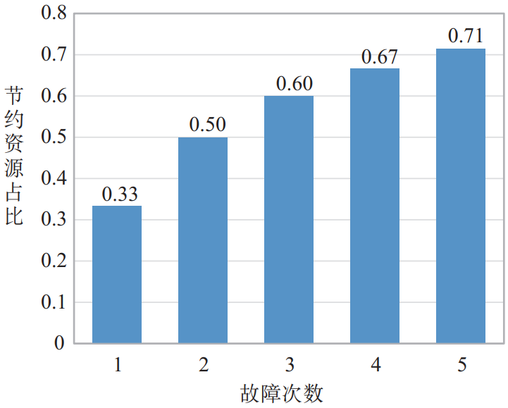 傳統(tǒng)的1+1保護(hù)在出現(xiàn)故障后,一方面需要恢復(fù)業(yè)務(wù),另一方面需要重新計(jì)算并占用端到端資源,在多次故障的情況下,占用的冗余資源成倍增長(zhǎng)。在引入光層恢復(fù)后,當(dāng)工作路徑發(fā)生故障時(shí),首先通過(guò)電層保護(hù)實(shí)現(xiàn)快速倒換,之后在原工作路徑進(jìn)行光層恢復(fù)作為備用路徑,無(wú)需重復(fù)占用端到端資源。在多次故障情況下,通過(guò)光電協(xié)同實(shí)現(xiàn)永久1+1相對(duì)于傳統(tǒng)永久1+1保護(hù),節(jié)約資源占比如圖9所示。