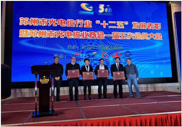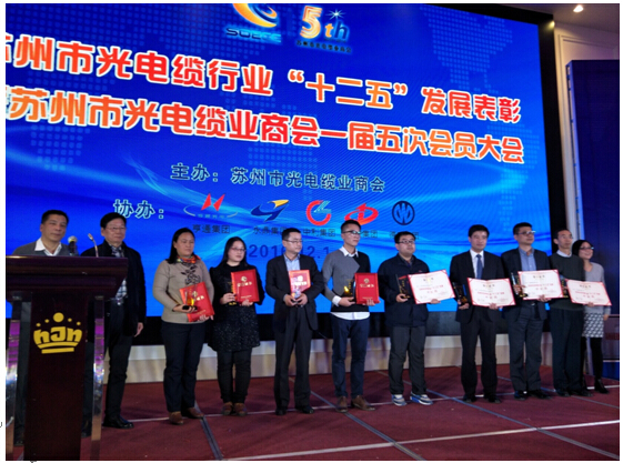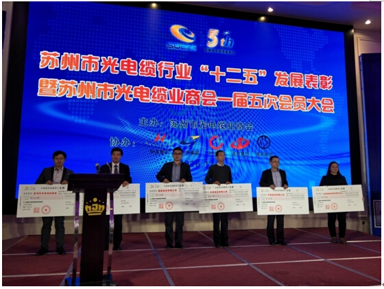Iccsz訊 2016年12月1日,蘇州市光電纜行業(yè)“十二五”發(fā)展表彰暨蘇州市光電纜行業(yè)商會一屆五次會員大會順利召開。會上通鼎集團與其他8家企業(yè)被表彰為蘇州市光電纜行業(yè)“十二五”發(fā)展“功勛獎”,通鼎互聯(lián)總裁蔣小強代表集團上臺領獎。