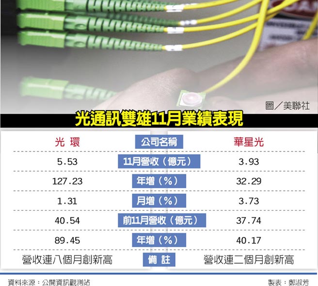 華星光也不遑多讓,11月營收也以3.93億元創(chuàng)高,較上月的3.79億元,月增3.73%,相較于去年的2.97億元,年增率更達到32.29%,累計前11月營收37.74億元,也較去年同期的26.93億元,激增40.17%。