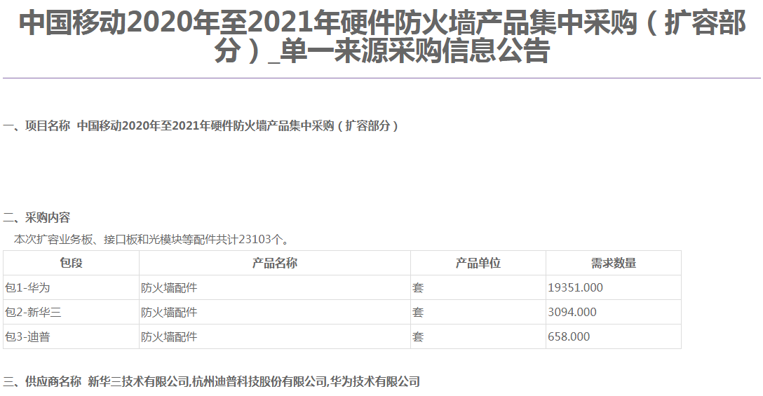 ICC訊 31日消息,中國移動公布2020-2021年硬件防火墻產(chǎn)品(擴(kuò)容部分)單一來源采購信息公告,本次采購內(nèi)容為擴(kuò)容業(yè)務(wù)板、接口板和光模塊等配件共計23103個。