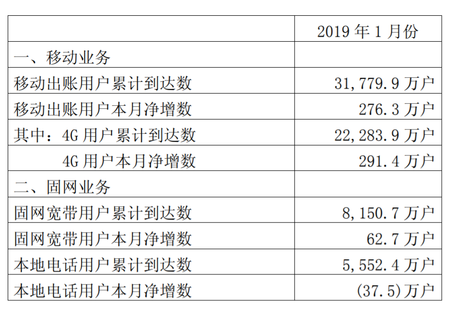 中國電信1月份凈增494萬戶4G用戶,較上月的463萬戶增長6.7%,累計(jì)用戶數(shù)達(dá)2.4737億戶。如將2G及3G均計(jì)入,1月份中國電信移動(dòng)用戶凈增426萬戶,至3.0726億戶。固網(wǎng)業(yè)務(wù)方面,1月起本地固話用戶減少15萬戶,累計(jì)為1.1633億戶。有線寬帶用戶新增73萬戶,累計(jì)1.4652億戶。截至2018年12月底,中國電信光纖寬帶(FTTH)用戶數(shù)達(dá)到約1.4066億戶,2018年凈增約1449萬戶。