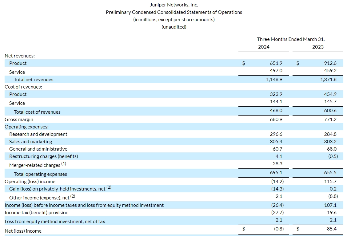 ICC訊(編譯:Vicki)Juniper網(wǎng)絡(luò)公布了截至到2024年3月31日第一季度財(cái)務(wù)業(yè)績。