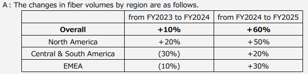 數(shù)據(jù)顯示,2024財(cái)年全球光纖銷(xiāo)量同比增長(zhǎng)10%,2025財(cái)年預(yù)計(jì)同比大增60%。分區(qū)域看,北美2024財(cái)年銷(xiāo)量增長(zhǎng)20%,2025財(cái)年預(yù)計(jì)增長(zhǎng)50%;中南美市場(chǎng)從2024財(cái)年下降30%轉(zhuǎn)為2025財(cái)年增長(zhǎng)20%;歐洲、中東及非洲(EMEA)地區(qū)則從下降10%轉(zhuǎn)為增長(zhǎng)30%。