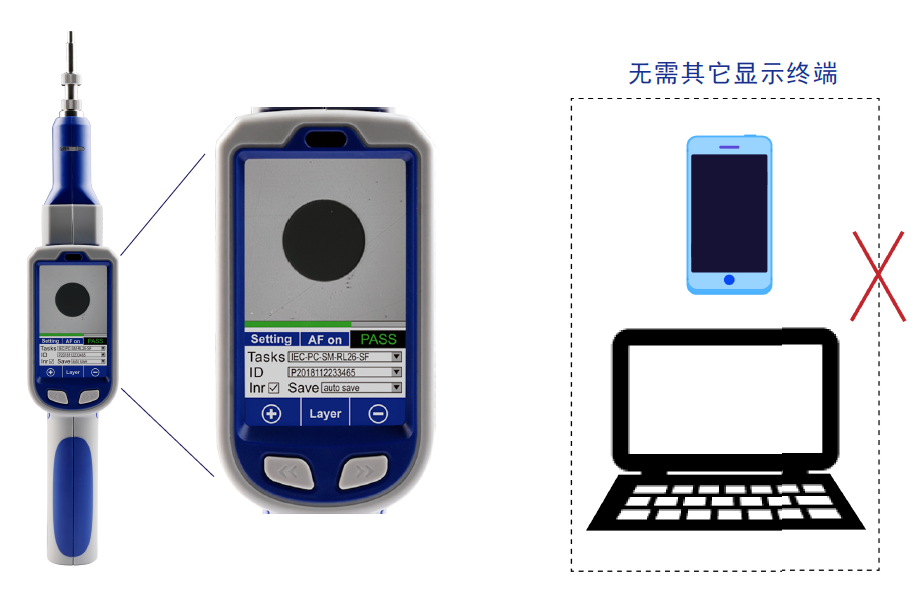 AutoGet Wifi采用一體式設計, 集成3.2”高清觸摸屏,用戶不需要任何第三方顯示終端,即可實時查看圖像和分析結(jié)果,獨立、便攜地輕松實現(xiàn)光纖端面的檢測和分析。集成光感可以根據(jù)環(huán)境光線明暗自動調(diào)節(jié)屏幕亮度。