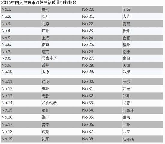 2015中國(guó)大中城市退休生活質(zhì)量指數(shù)排名