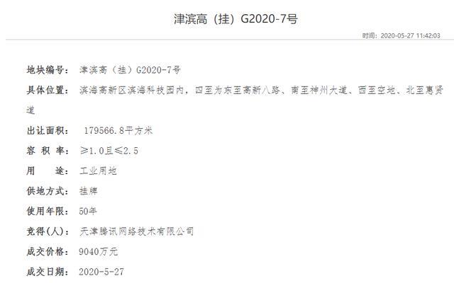 天津土地交易中心公告顯示,該地塊于2020年4月28日掛牌出讓。地塊四至為東至高新八路、南至神州大道、西至空地、北至惠賢道?,F(xiàn)狀已達到場清地平。出讓土地面積約18萬平方米,50年工業(yè)用地,容積率要求不低于1.0且不高于2.5,建筑系數(shù)≥35%,建筑密度≤55%,綠地率20%。投資強度不低于6210萬元/公頃。最終騰訊以9040萬元底價成功拿地。