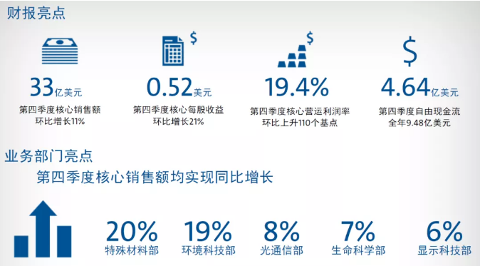 特殊材料部第四季度的銷售額為5.45億美元,同比增長20%,主要得益于市場對高端蓋板材料的強勁需求、公司在信息技術(shù)市場的產(chǎn)品優(yōu)勢以及市場對半導(dǎo)體相關(guān)材料的需求。該業(yè)務(wù)2020全年銷售額增長18%,達(dá)到19億美元。