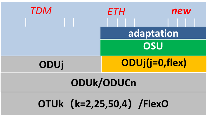 OSU作為一種創(chuàng)新的低階容器,能夠承載2Mbit/s到100Gbit/s的多顆??蛻?hù)側(cè)業(yè)務(wù)接入;同時(shí)基于硬管道安全隔離的屬性,提供穩(wěn)定的低時(shí)延、靈活可調(diào)可控能力,可以有效地匹配高品質(zhì)專(zhuān)線(xiàn)入云業(yè)務(wù)的差異化需求;更重要的是,OSU支持快捷的無(wú)損帶寬調(diào)整能力,是面向高品質(zhì)云網(wǎng)融合應(yīng)用的最佳承載技術(shù)。同時(shí),OSU很好地兼容了現(xiàn)有OTN網(wǎng)絡(luò)成熟的ODUk/ODUCn技術(shù)體系,支持平滑升級(jí),可以保護(hù)現(xiàn)有OTN網(wǎng)絡(luò)投資,因此得到了運(yùn)營(yíng)商的一致認(rèn)可。OSU業(yè)務(wù)封裝及復(fù)用結(jié)構(gòu)如2所示。