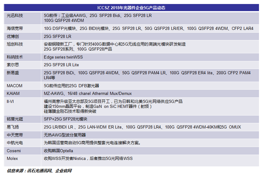 2018年,隨著3GPP 5G非獨立(NSA)和獨立(SA)組網(wǎng)標準的正式凍結(jié),我國運營商同步啟動規(guī)劃和設(shè)計5G試點和預商用方案,5G邁向商用的步伐逐步加快。5G商用,承載先行,5G承載網(wǎng)建設(shè)帶來5G光器件市場巨大需求,而面向5G承載,25/50/100Gb/s新型高速光模塊將逐步在前傳、中傳和回傳接入層引入,N×100/200/400Gb/s高速光模塊也將在回傳匯聚和核心層引入?;仡?span>2018年,主要的光器件企業(yè)在積極為5G機遇的到來做充足的準備。2018年光器件企業(yè)5G動態(tài):