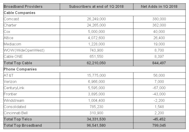 截至Q118,美國大型有線電視運營商和電信運營商的寬帶互聯(lián)網(wǎng)用戶總和達到9650萬,其中大型有線電視運營商擁有6220萬,大型電信運營商擁有3430萬。