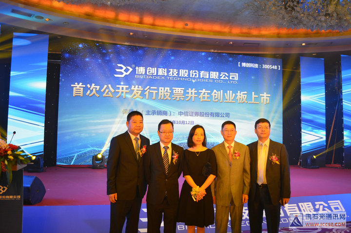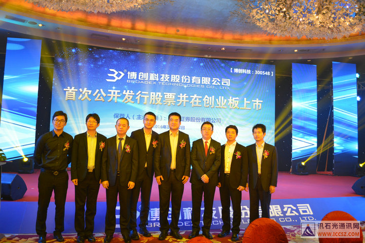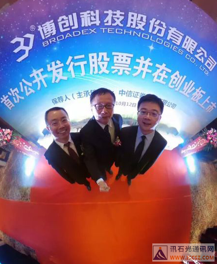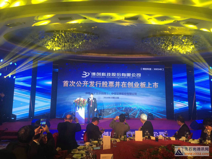 Iccsz訊 深秋十月聽鐘聲,上市喜宴看前程!10月12日上午9點,博創(chuàng)科技股份有限公司在深圳證券交易所成功敲鐘上市,股票發(fā)行首日表現(xiàn)優(yōu)異,漲幅44%。會場上,博創(chuàng)科技董事長朱偉對社會各界的支持和厚愛表示衷心感謝,博創(chuàng)科技所有同仁因夢想而堅持,因堅持而進(jìn)步,成就光纖互聯(lián)萬事萬物,成就未來的數(shù)字生活的愿景!牢記提供互聯(lián)網(wǎng)、物聯(lián)網(wǎng)的集成化產(chǎn)點的目的,而博創(chuàng)科技愿與社會大眾一起在更廣闊的天空翱翔!