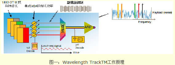 Wavelength TrackTM技術(shù)是阿爾卡特朗訊的一項專利技術(shù),其實現(xiàn)原理是對每個進入系統(tǒng)的波長(可以是第三方的異種波長)調(diào)制一個副載波,從而給每個波道編碼生成唯一的波道標識WaveKeys以便管理光功率和識別光路由 (如圖一所示):