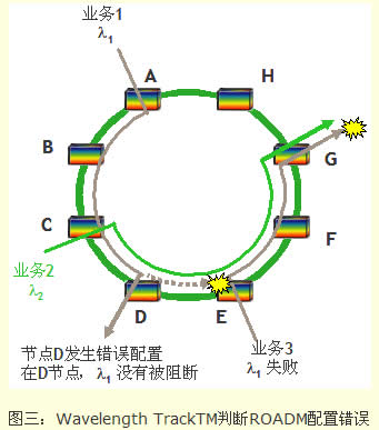 以F/ROADM錯配情況檢測來說,如果業(yè)務(wù)1 (1)和業(yè)務(wù)2 (2)運行正常,但部署業(yè)務(wù)3(1)失敗 ,所有波道的功率沒有問題,光放沒有告警,顯示正常。在傳統(tǒng)的運維方式下,維護人員無法定位故障發(fā)生在哪個節(jié)點或哪段光纖,需要派遣人員到個站點查看,往往需要需要數(shù)個小時隔離定位F/R/TOADM配置的問題。在有Wavelength TrackTM的情況下,操作人員可以在憑借Wavelength key在網(wǎng)管中心很快速地判斷出故障出在D點(因為業(yè)務(wù)1使用1從A-D是正常的),原因很可能是1未在D點阻斷,導(dǎo)致與業(yè)務(wù)3出現(xiàn)波長沖突?;谶@樣的判斷,操作員可以遠程控制在D點阻斷1,從而快速恢復(fù)業(yè)務(wù)。