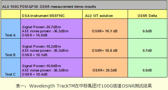 在2011年中國移動集團組織的OTN測試中,阿爾卡特朗訊采用這種方式進行了100G通道的測量,經(jīng)過與儀表比對,其誤差在1dB之內(nèi),完全達到實際應(yīng)用的要求。