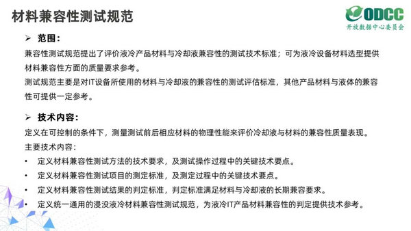 傳統(tǒng)風冷產(chǎn)品用空氣作為媒介,依靠氣體流動對發(fā)熱的電子元件進行冷卻降溫,而浸沒式液冷產(chǎn)品是一種直接接觸型液冷技術(shù),它將發(fā)熱的電子元件浸沒在冷卻液中,依靠液體流動循環(huán)帶走熱量。由于液冷技術(shù)的前沿性及IT設(shè)備材料的復雜性,當前業(yè)界對液冷材料兼容性無成熟統(tǒng)一且可參考的經(jīng)驗和規(guī)范標準,液冷產(chǎn)品材料選型無統(tǒng)一技術(shù)要求。液冷IT設(shè)備長期運行可靠性要求所有浸沒在冷卻液中的物料均應(yīng)與冷卻液長期兼容。因此,浸沒液冷材料兼容性有統(tǒng)一可評價判定的技術(shù)標準尤為重要。