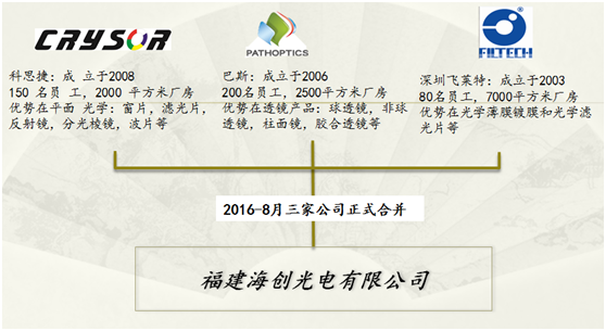 Iccsz訊 合并可謂是中小企業(yè)發(fā)展壯大的一條有效途徑,強(qiáng)強(qiáng)聯(lián)合可以充分發(fā)揮各家強(qiáng)項(xiàng),做到優(yōu)勢互補(bǔ),創(chuàng)造更高效益。在光學(xué)元器件領(lǐng)域,就有這么一家企業(yè),她通過合并成為一家實(shí)力強(qiáng)勁的光學(xué)元件廠商。這家企業(yè)就是福建海創(chuàng)光電有限公司(以下簡稱海創(chuàng)光電),海創(chuàng)光電成立于2016年,由福州巴斯光電技術(shù)有限公司、福州科思捷光學(xué)有限公司和深圳市飛萊特科技有限公司合并成立。