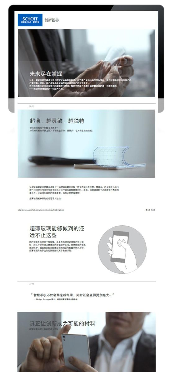 該平臺(tái)的項(xiàng)目經(jīng)理之一、肖特中國(guó)市場(chǎng)營(yíng)銷(xiāo)與戰(zhàn)略規(guī)劃總監(jiān)張琦女士表示:“玻璃創(chuàng)新視界的每個(gè)故事都是基于這樣一種理念,即玻璃可改進(jìn)產(chǎn)品或激發(fā)產(chǎn)品創(chuàng)意,并因此改善數(shù)百萬(wàn)人的生活。通過(guò)將傳統(tǒng)的技術(shù)講解與互動(dòng)性的講故事形式相結(jié)合,肖特創(chuàng)新視界旨在釋放未被發(fā)掘的創(chuàng)新潛力并激發(fā)每位訪(fǎng)客的好奇心。玻璃創(chuàng)新視界上展示的故事永遠(yuǎn)不會(huì)完整,因?yàn)檫@些玻璃材料都可能成為我們創(chuàng)造出前所未有的產(chǎn)品的創(chuàng)新之源。”