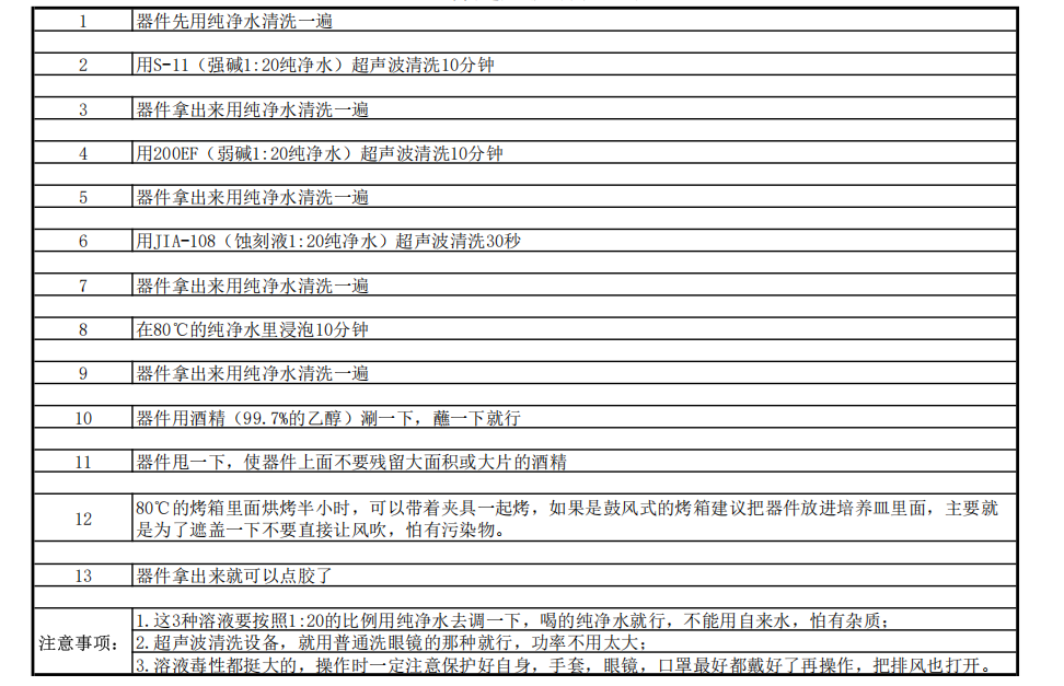 配合超聲波的清潔液,可以采用強(qiáng)堿+弱堿+蝕刻液的組合清潔方式,或者單一的酒精配方;需根據(jù)材料特點(diǎn)進(jìn)行選擇。