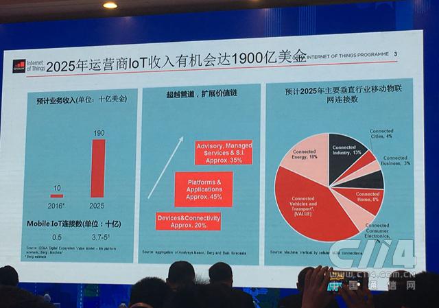 ICCSZ訊 在近日舉行的2017年物聯(lián)網(wǎng)產(chǎn)業(yè)峰會上,GSMA中國戰(zhàn)略合作總經(jīng)理龐策分享了GSMA對全球物聯(lián)網(wǎng)的發(fā)展趨勢和數(shù)字預(yù)測。他表示,到2025年全球電信運營商物聯(lián)網(wǎng)收入有望達到1900億美元。