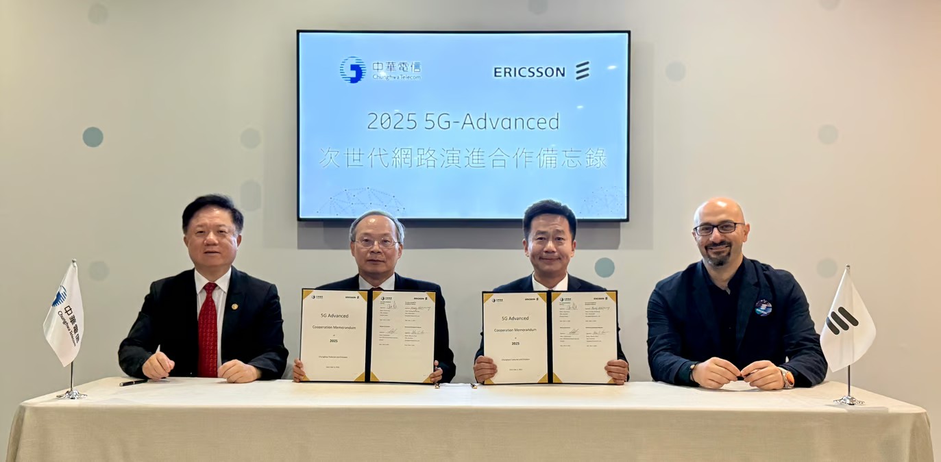中華電信首席技術(shù)官兼執(zhí)行副總裁黃志雄與愛立信臺灣地區(qū)總裁周永明在2025年世界移動通信大會上簽署了諒解備忘錄。中華電信董事長錢立新、愛立信東北亞區(qū)總裁兼高級副總裁Chafic Nassif等人作見證。