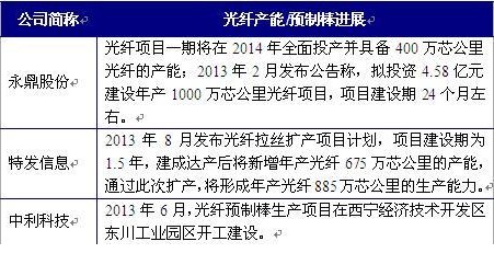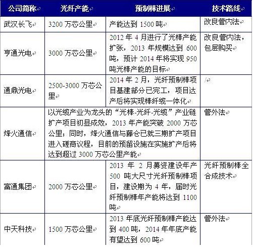 前瞻網光纖光纜行業(yè)報告數據顯示,2013年,長飛的光纖產能達到3200萬芯公里,光纖預制棒產能達到1500噸;亨通光電的光纖產能達到3000萬芯公里,光棒產能規(guī)模達到600噸,2014年將實現950噸光棒產能的目標;通鼎光電的光纖產能達到2500-3000萬芯公里;烽火通信的“光棒-光纖-光纜”產業(yè)鏈擴產項目初顯成效,產能突破2000萬芯公里;富通集團的光纖產能達到2000萬芯公里,2017年左右光纖預制棒年產能將達到1100噸;中天科技的光纖產能達到1500萬芯公里,光纖預制棒產能達到400噸。