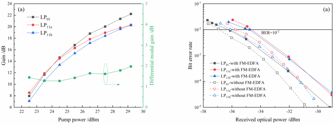 圖2(a)MDM系統(tǒng)各信道的增益和DMG隨泵浦功率的變化。(b)有、無FM-EDFA時MDM系統(tǒng)各信道的靈敏度曲線