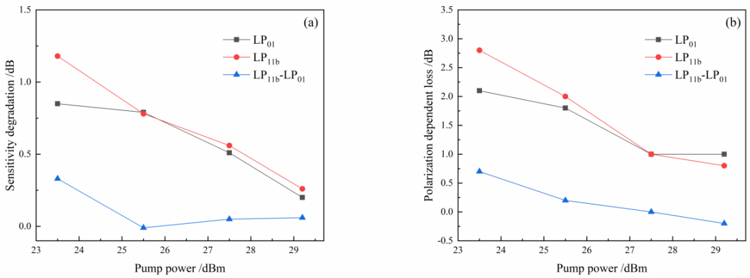 圖3 LP01和LP11b信道的靈敏度劣化和偏振相關(guān)損耗隨泵浦功率的變化。(a)靈敏度劣化;(b)偏振相關(guān)損耗