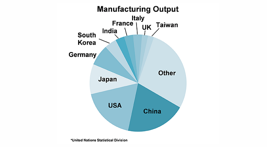 制造業(yè)一個(gè)更引人注目的方面是這個(gè)市場(chǎng)相當(dāng)大。根據(jù)世界銀行的數(shù)據(jù),2020年制造業(yè)占全球GDP的16%。這是一個(gè)相當(dāng)集中的產(chǎn)業(yè),從地區(qū)角度看,中國(guó)、美國(guó)和日本創(chuàng)造了全球近一半的制造業(yè)產(chǎn)出。