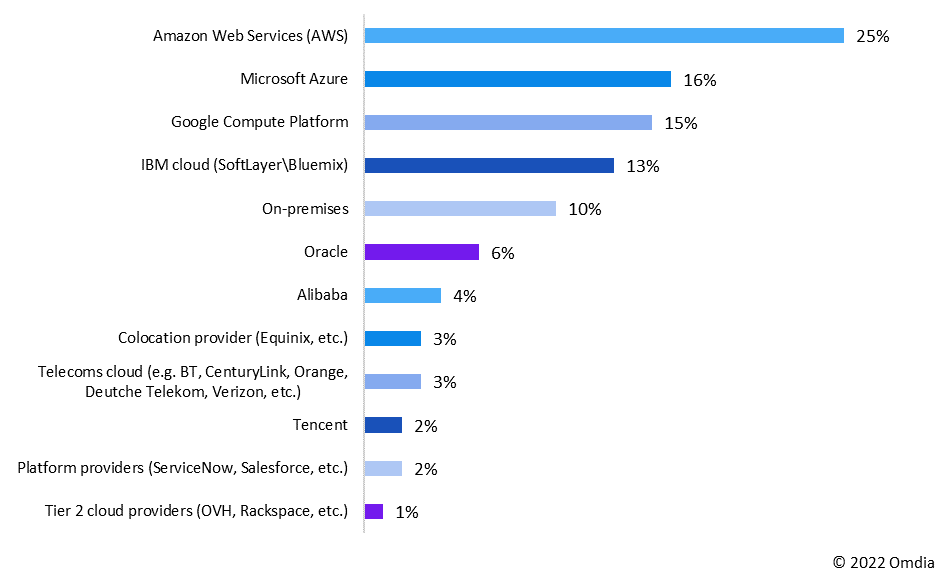 在過(guò)去幾個(gè)月里,所有三家全球最大的服務(wù)提供商(AWS、微軟Azure、谷歌)都出現(xiàn)了服務(wù)中斷報(bào)道。根據(jù)Omdia的《IoT, Cloud, 5G, and Digital Workplace–IT Enterprise Insights 2022》報(bào)告顯示,這三家服務(wù)提供商占據(jù)所有數(shù)據(jù)中心工作負(fù)載的的50%以上(僅AWS就占全球數(shù)據(jù)中心工作負(fù)載的25%)。