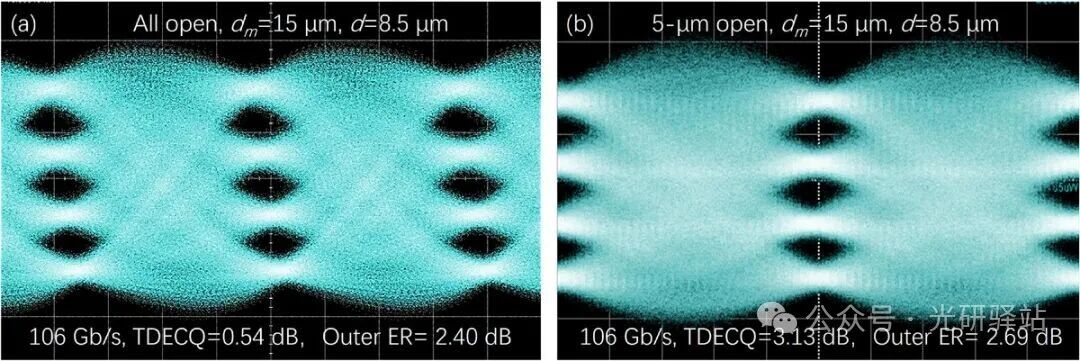 ▲圖5 眼圖測(cè)試106 Gb/s PAM4:(a) all-open TDECQ=0.54 dB,ER=2.40 dB, (b) 5-μm-open TDECQ=3.13 dB,ER=2.69.