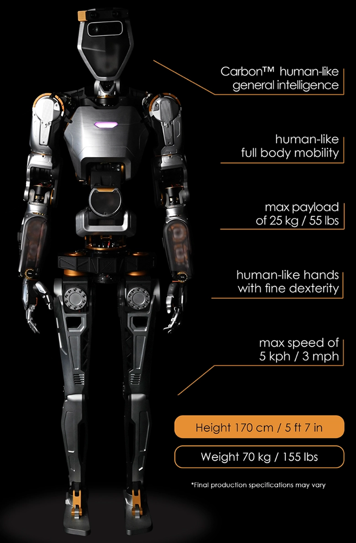 Carbon 融合現代人工智能技術,將自然語言轉化為現實世界的行動,具有可解釋、可審查的推理能力,負責規(guī)劃任務和運動計劃,使得 Phoenix 能像人一樣思考、行動,從而完成工作任務。它的工作負載可以達到 25 公斤,并且能以 5 公里每小時的速度進行移動。