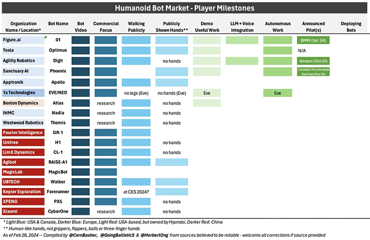 有網友做了一個統(tǒng)計所有機器人公司產品向人類「進化」的進度的表格,可以看出,頭部幾家公司已經能夠完成自主的工作任務了。